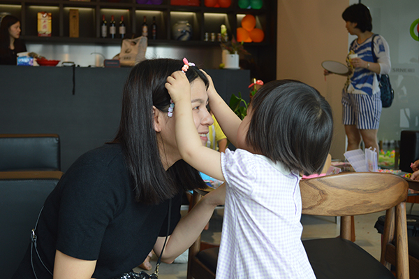 手工創(chuàng)作:剛從菜園里戀戀不舍離開,擁有無限的活力小朋友們?nèi)匀痪Τ渑?。接下來是手工環(huán)節(jié),小朋友在媽媽的指導下完成作品,代表自己的點點心意,親手送給媽媽。