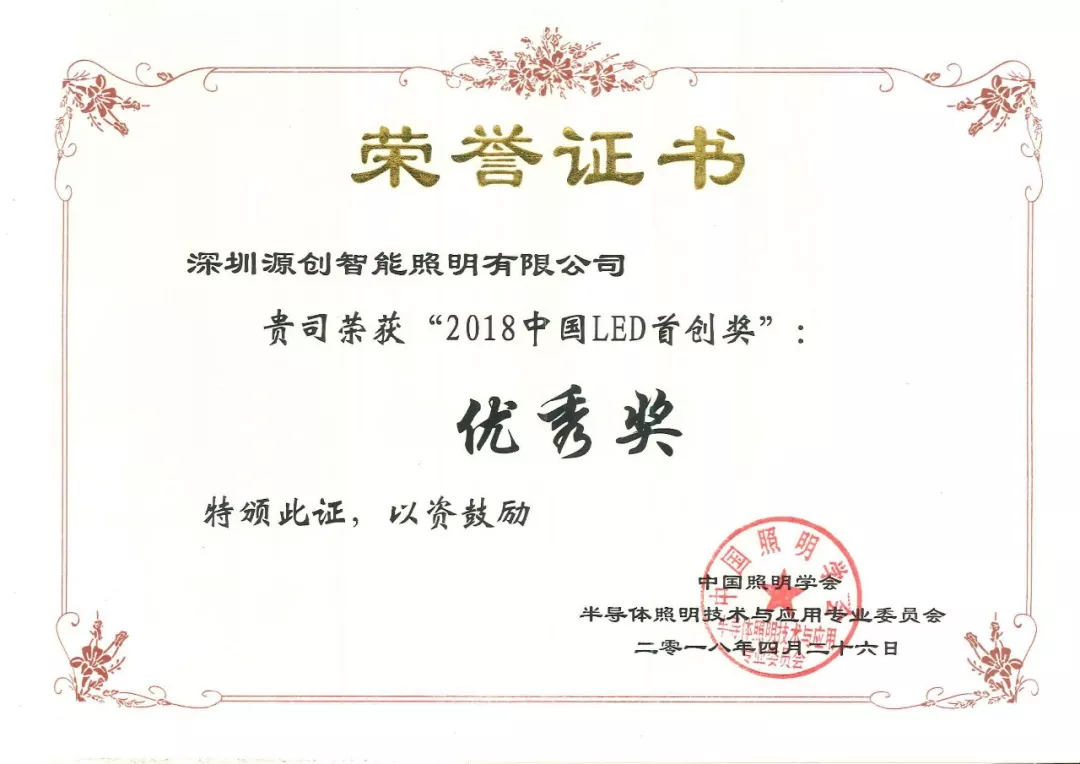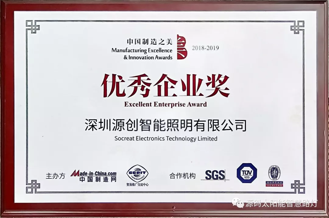 2019年1月9日,第十七屆深圳企業(yè)創(chuàng)新紀錄成果發(fā)布會暨深圳工業(yè)總會、深圳市先進制造業(yè)聯合會、深圳市企業(yè)品牌建設促進會2018年度會員大會在深圳舉行。深圳源創(chuàng)智能照明有限公司,憑借在太陽能路燈創(chuàng)新技術的突出優(yōu)勢獲得“深圳企業(yè)創(chuàng)新(中國)紀錄”獎。