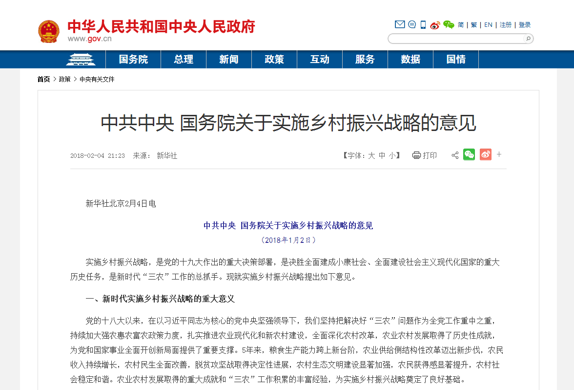 2018年1月2日,公布了2018年中央一號文件,即《中共中央國務(wù)院關(guān)于實(shí)施鄉(xiāng)村振興戰(zhàn)略的意見》 。2018年3月5日,國務(wù)院總理李克強(qiáng)在作政府工作報(bào)告時(shí)說,大力實(shí)施鄉(xiāng)村振興戰(zhàn)略。